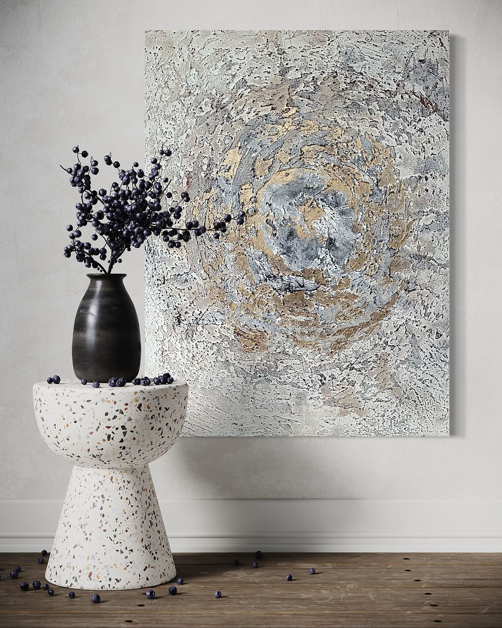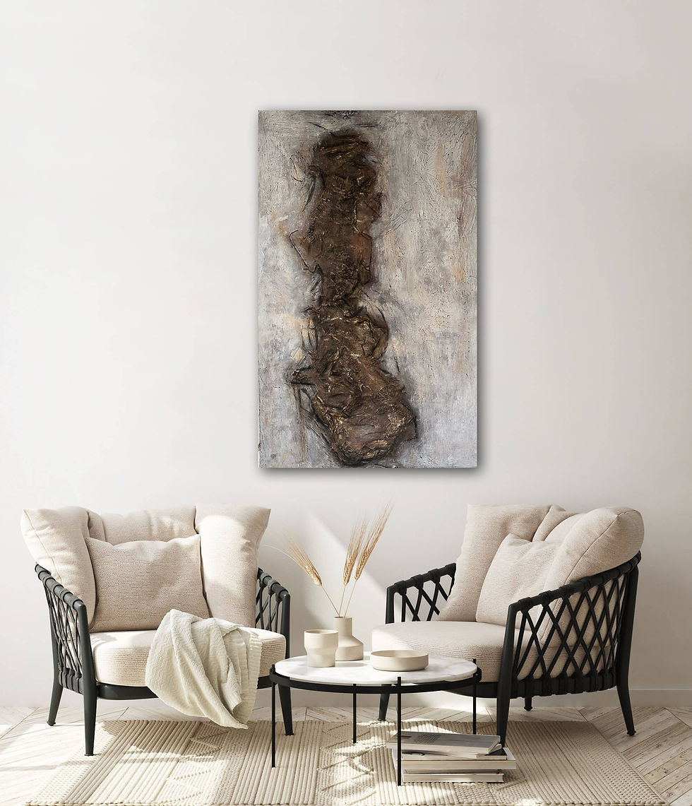 The reliefs often crumpled, like fabric, evoke the natural and fluid forms of rocks eroded by time and events. The sculptural textures create a 3D effect, invite to immerse themselves in a dreamlike and meditative landscape, where the strength of rock meets the delicacy of a soothing melody.